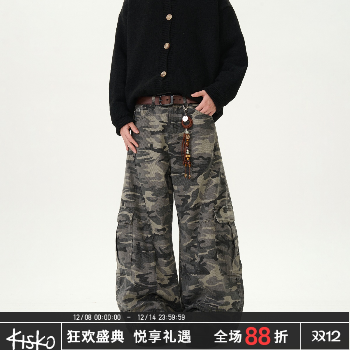 KISKO American retro camouflage wide-leg cargo pants trendy brand loose reverse wear design scimitar jeans for men and women