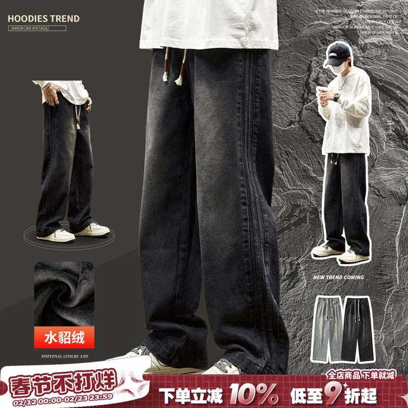 Jeans, men's winter American straight-leg pants, casual boys' men's pants, fleece pants, autumn and winter new loose trousers