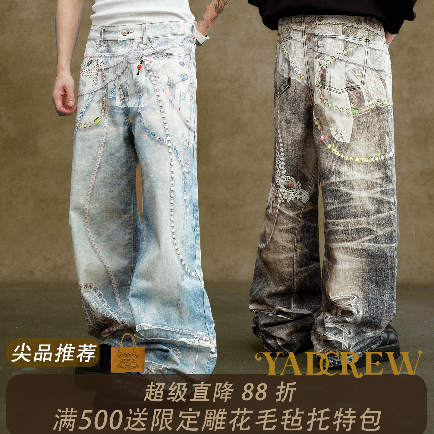 Qiao Jingwen X Fu Longfei X Chen He X Huang Shuo same style] American lace color bead chain printed denim straight-leg pants