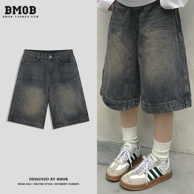 BMOB distressed washed straight loose high street denim shorts men's summer American vintage wide-leg cropped mid pants