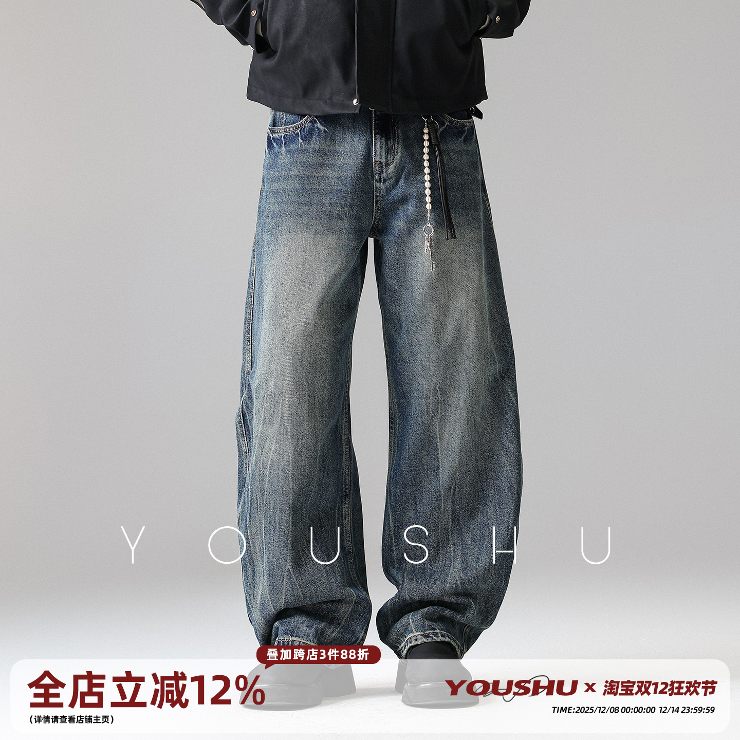 Youshu American fashion brand distressed jeans men's straight 2025 explosive new winter fleece wide-leg pants