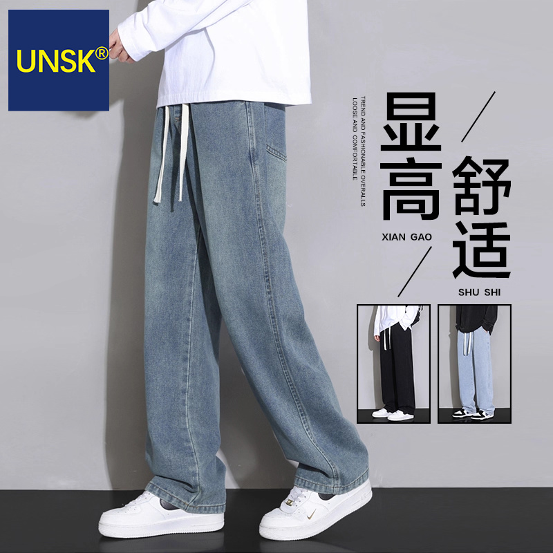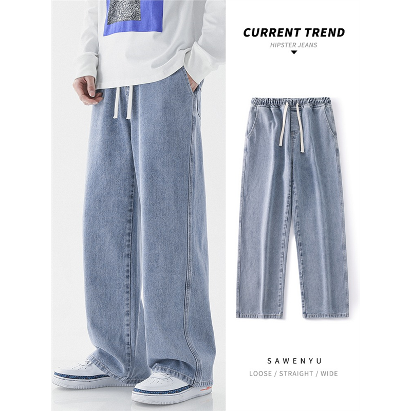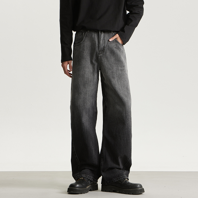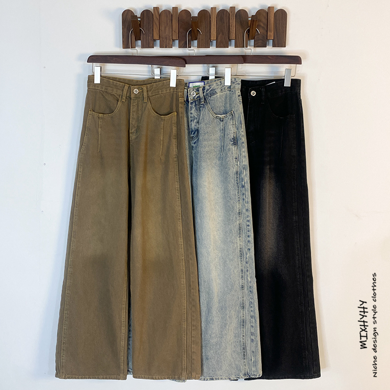 American retro denim pants men's new Hong Kong style ins solid color trendy brand loose wide-leg basic versatile straight-leg pants