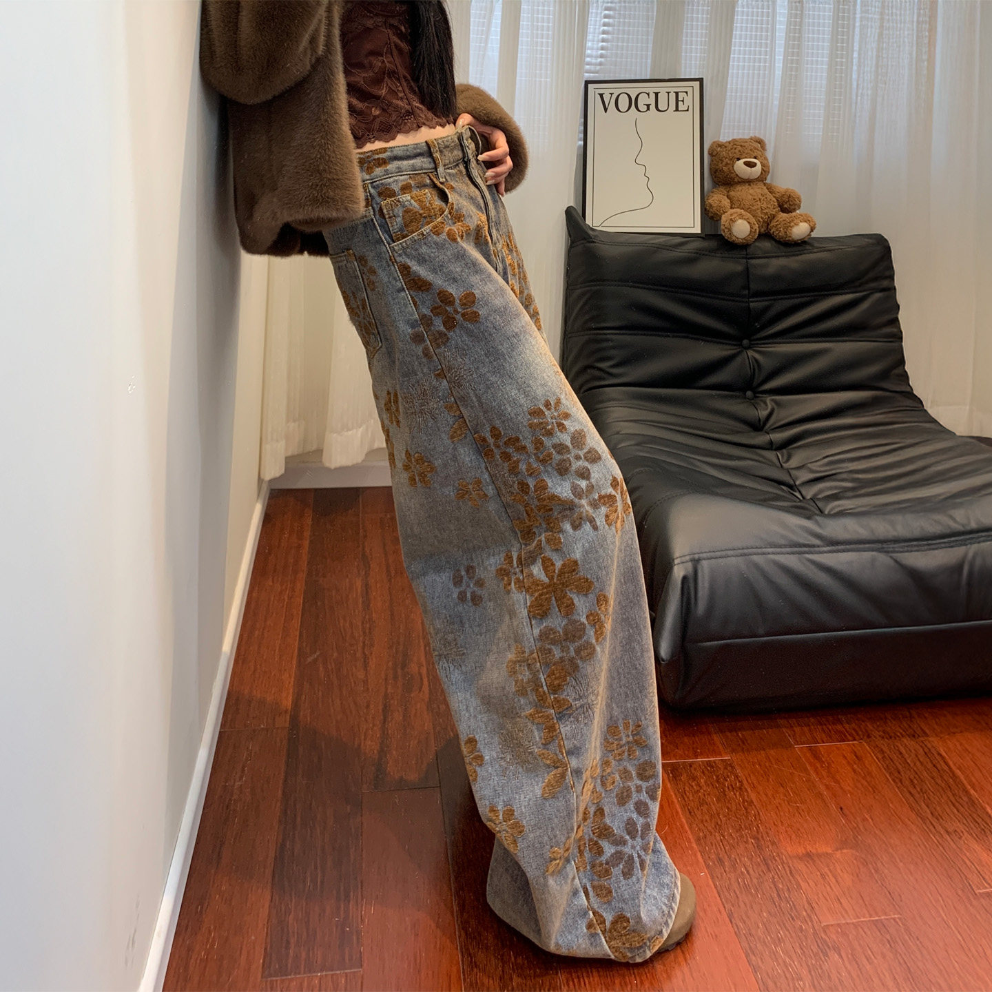 American retro jacquard scimitar jeans women's autumn and winter fleece plush size fat mm design sense slimming loose wide-leg pants