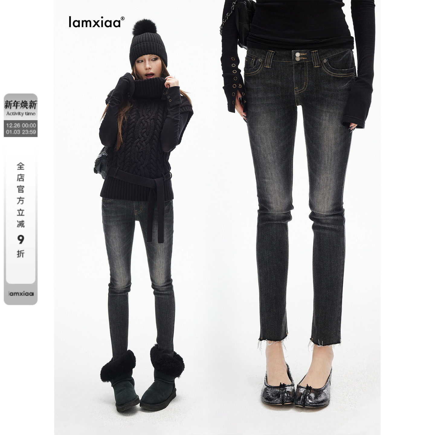 iamxiaa* cotton soft black stretch denim vintage washed pattern 90S street style double-button slim pants