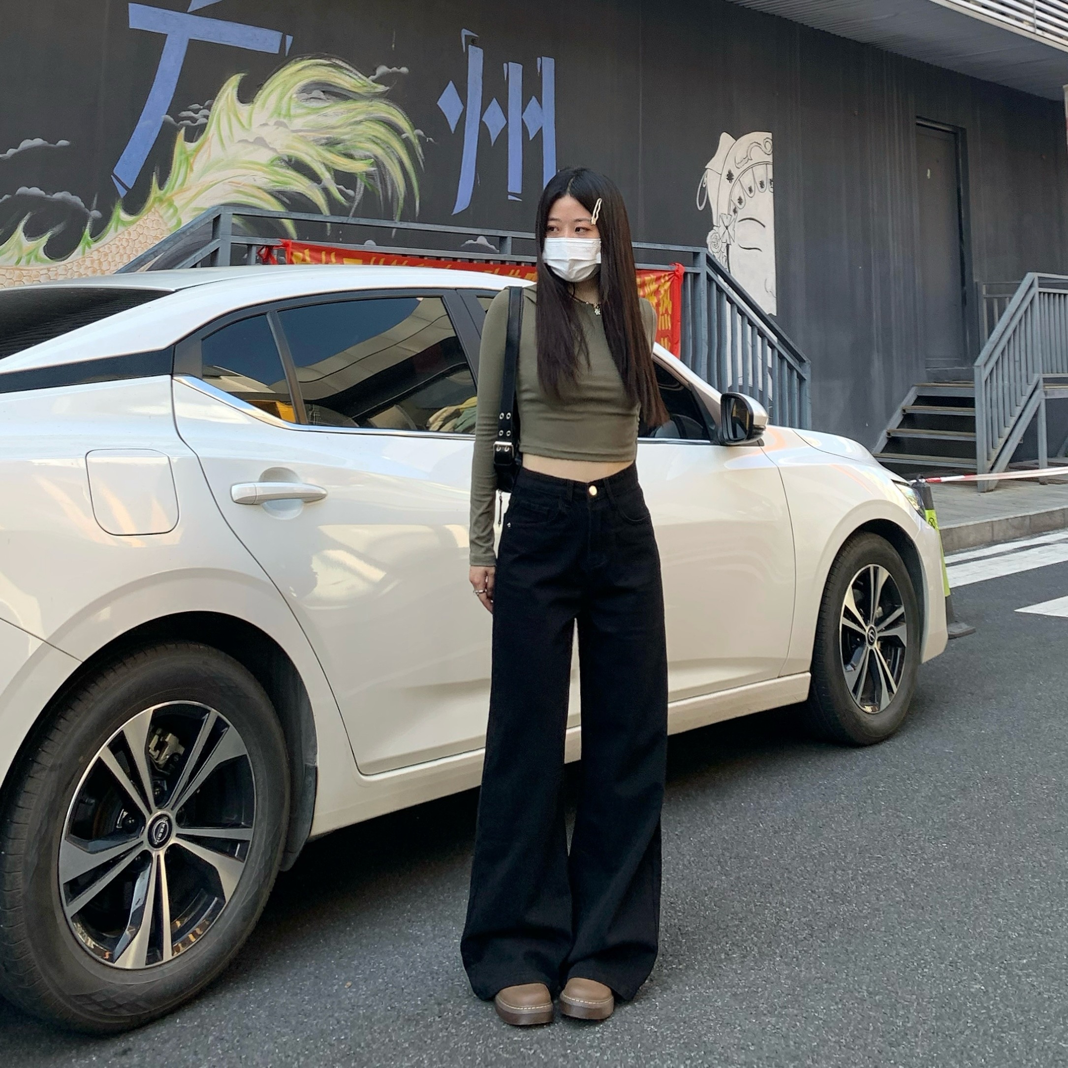 Pure brother's black wide-leg drape jeans for women's 2026 spring new versatile high-waisted loose slimming floor-length pants