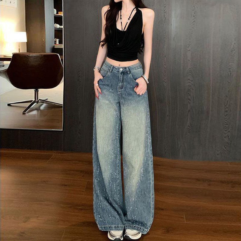 American retro design sense heavy industry hot diamond embroidery jeans women's y2k millennial style hot girl fashion floor-length pants