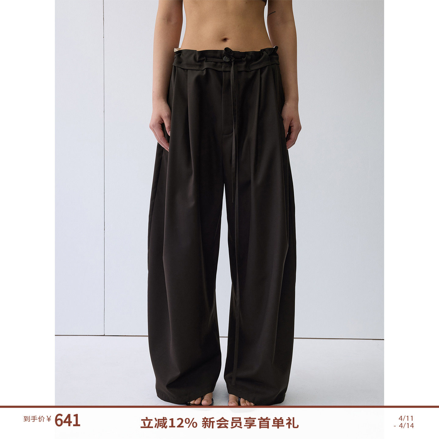 RandomPiece26 Wool blend pressed pleats slim design lightweight drape drawstring casual trousers