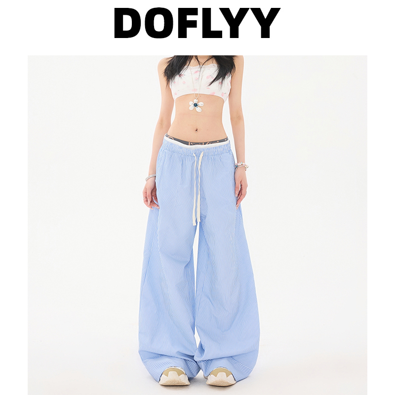 DOFLYY Korean Striped Slacks Women's 2025 Summer New Double-Waist Drawstring Design Lazy Loose Wide-leg Pants