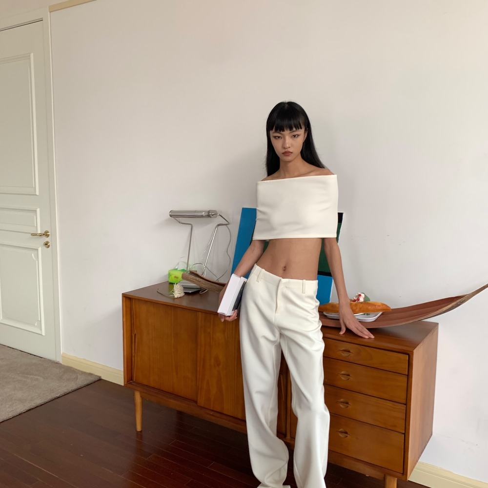 BUZHOU 24SS "Queen of Minimalism" beige stretch one-shoulder top low-rise straight-leg stacked trousers