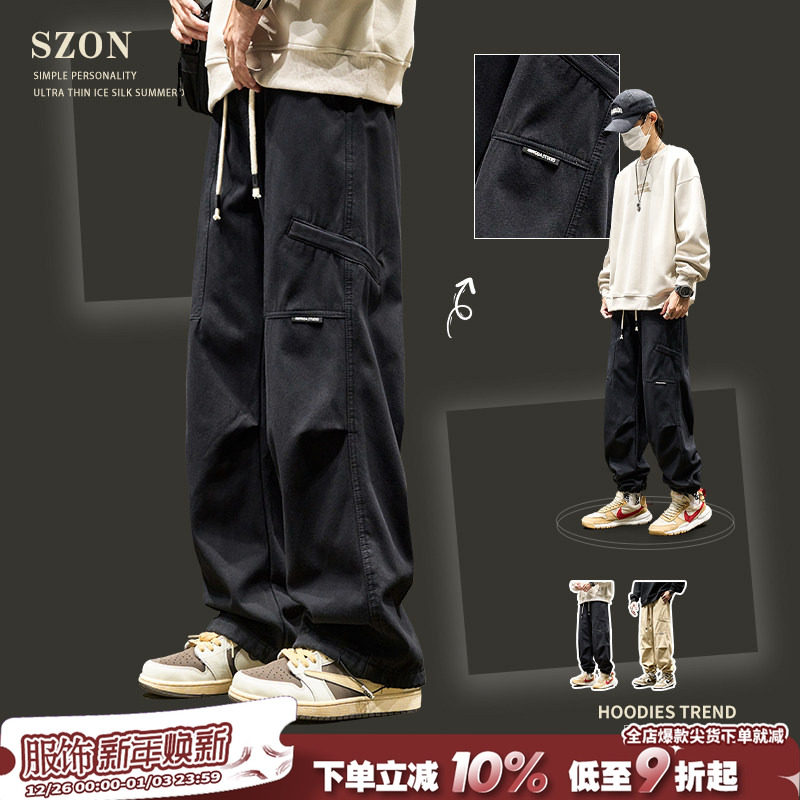 Cargo pants men's 2025 new fleece thickened drawstring straight pants spliced pleated American trendy brand paratroopers autumn and winter