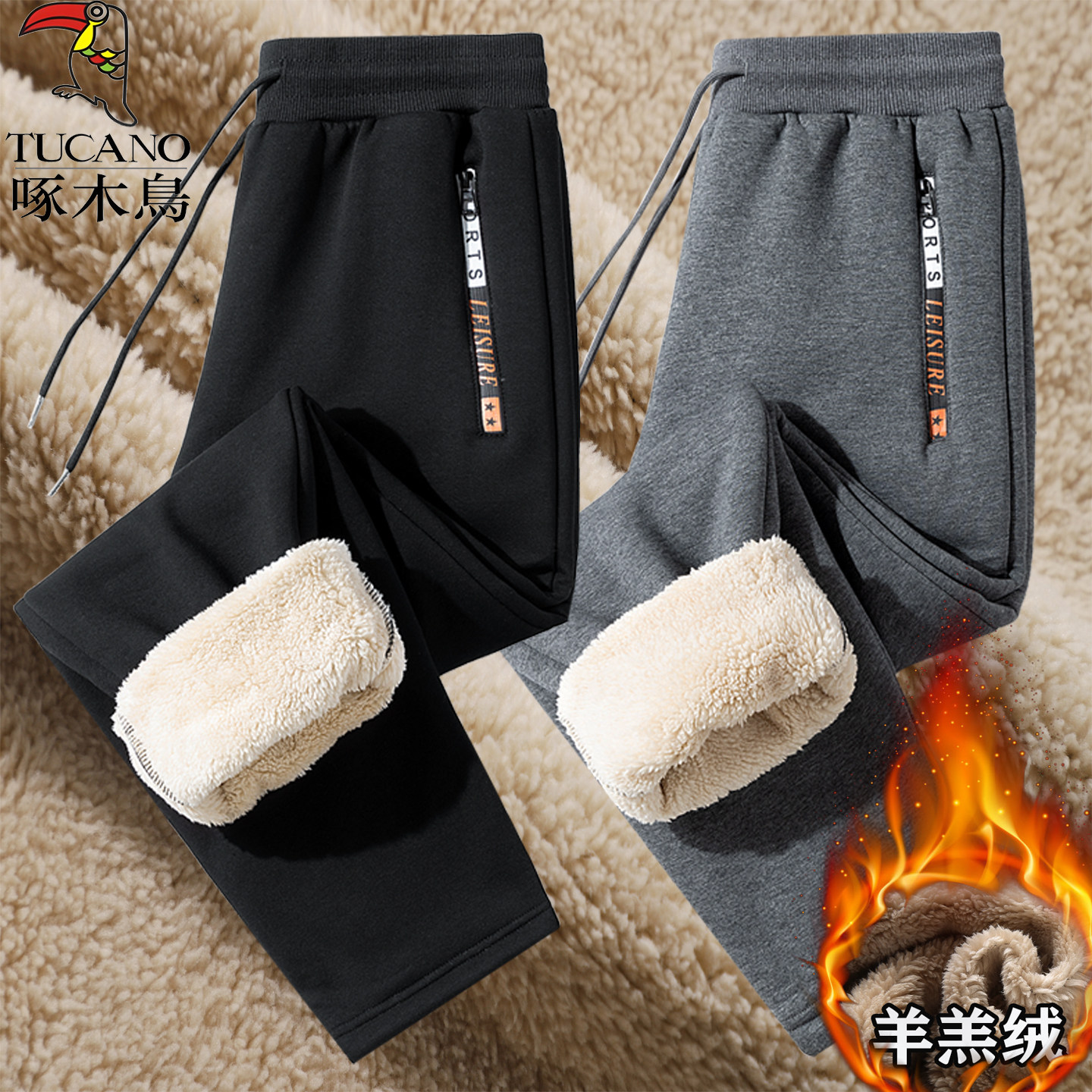 Woodpecker Cotton Lamb Fleece Pants Men's Winter Fleece Thickened Warm Slacks Loose Outer Sweatpants