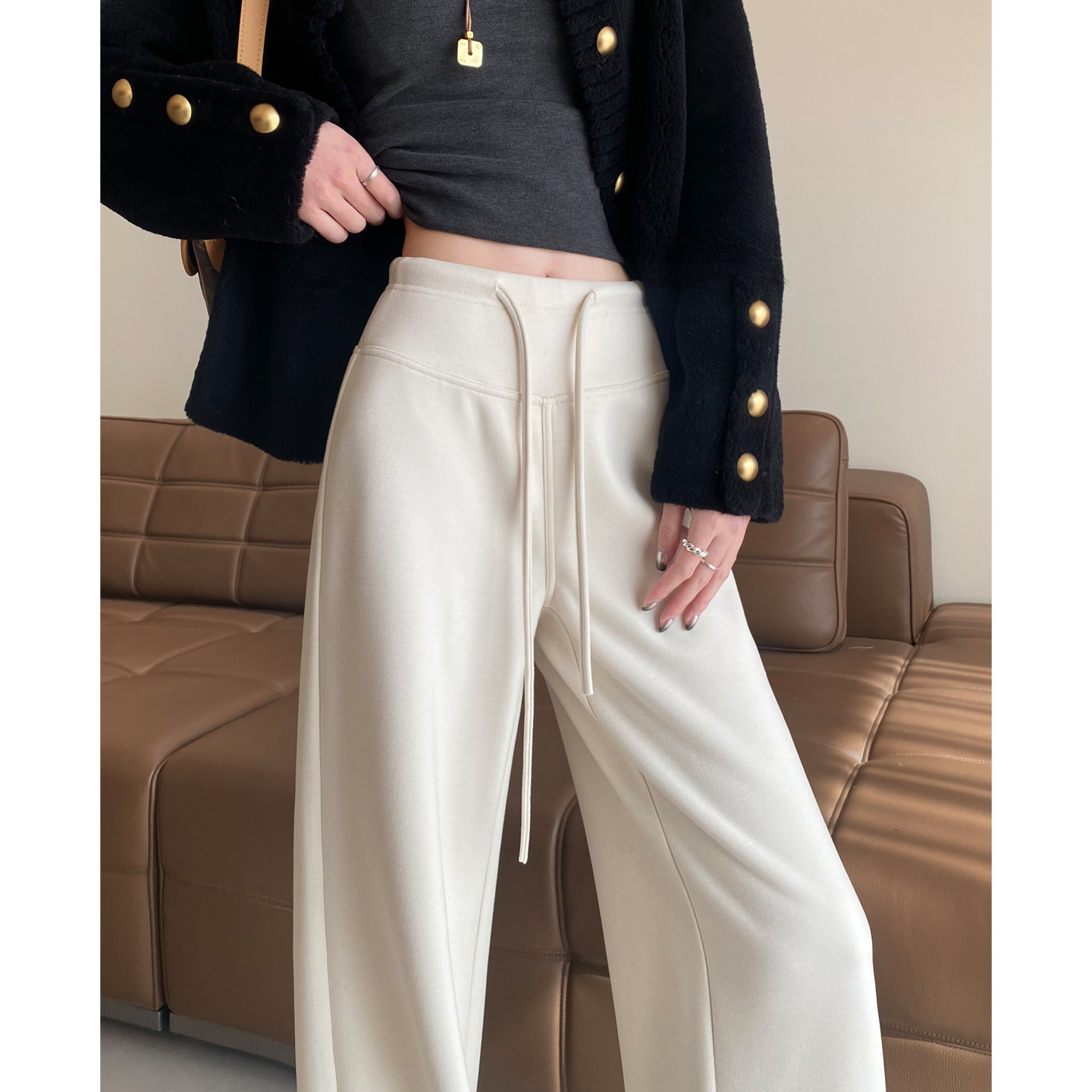Oatmeal white glutinous rice pants women's spring and autumn 2025 new straight drape lazy autumn and winter fleece loose wide-leg pants