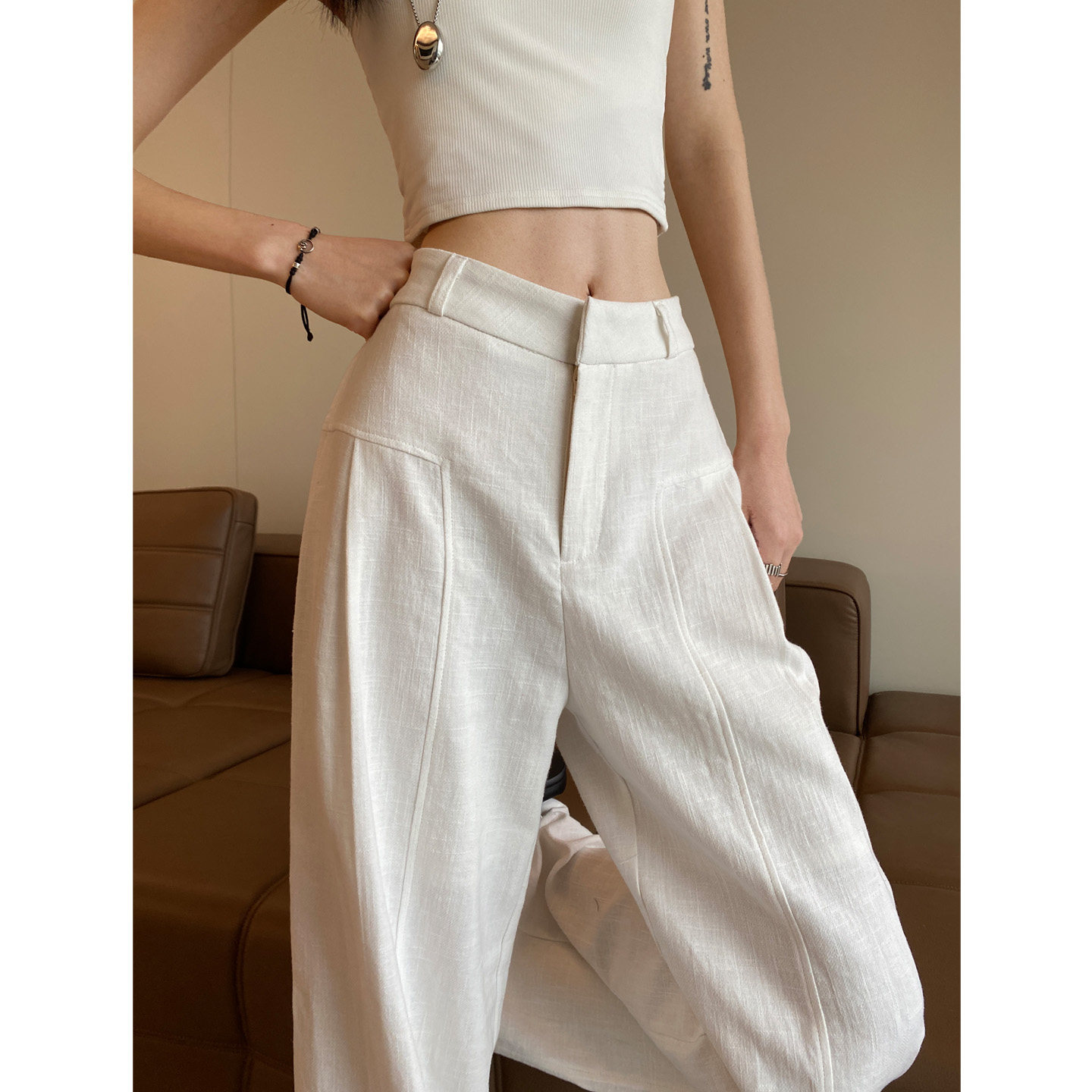 White ramie wide-leg pants women's summer thin high-waisted drape old money style suit straight cotton and linen casual pants