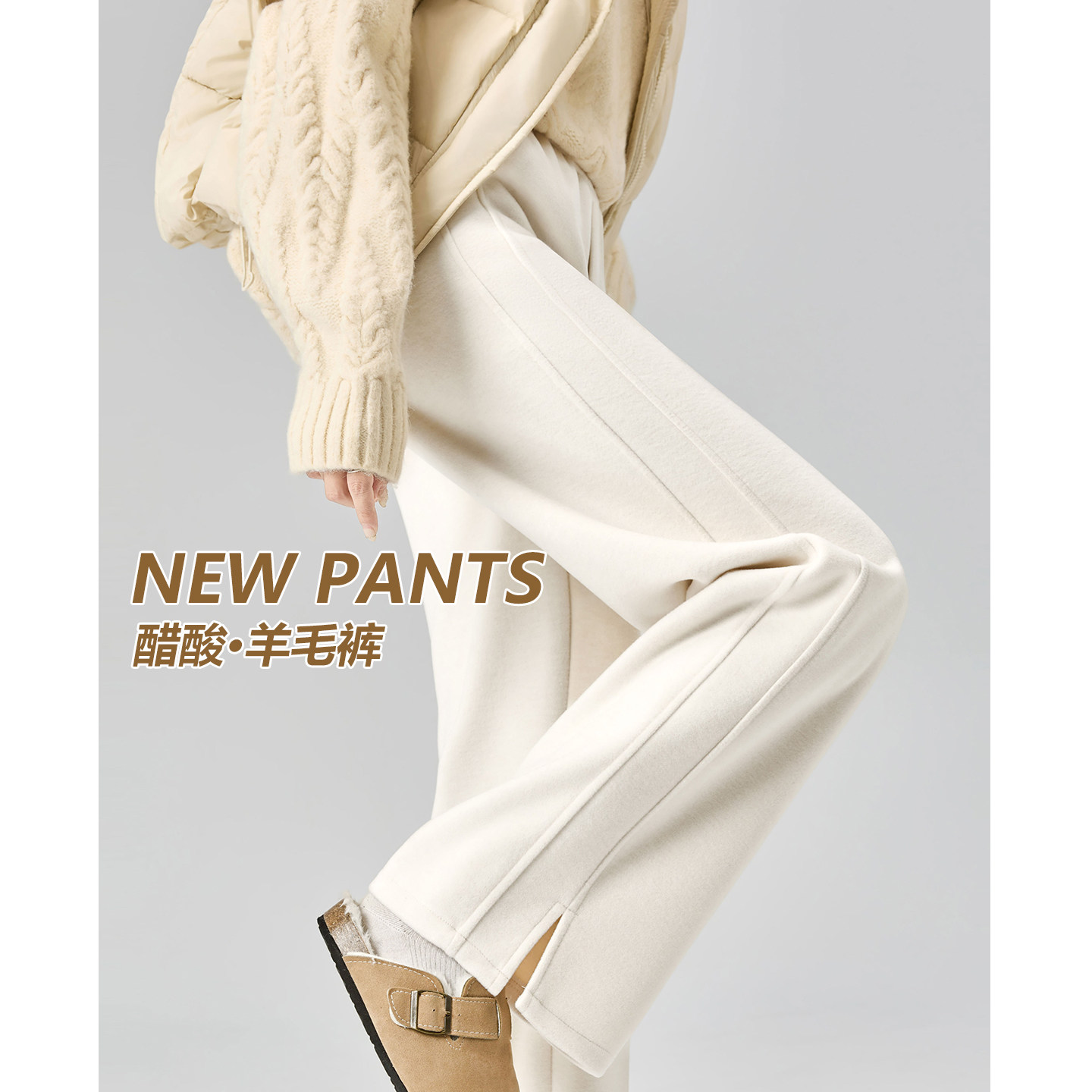 Acetate wool white wide-leg pants women's autumn and winter fleece thickened high-waisted drape woolen narrow straight slit pants