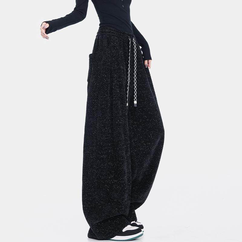 KEN STUDIO autumn and winter fleece black gypsophila drape drawstring slacks women's loose slimming wide-leg pants