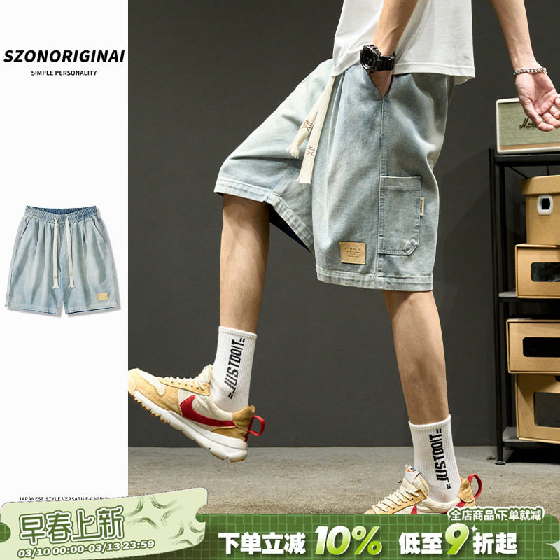 Denim shorts men's summer ins trendy brand washed old straight breeches Japanese retro workwear cropped pants thin style