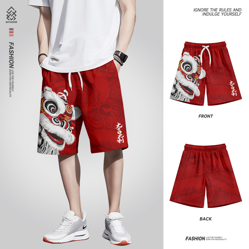 2025 summer new national tide lion quick-drying shorts men's Chinese style loose thin sports beach cropped pants
