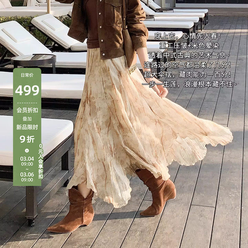 MEIYANG Ye Liujin skirt 26 spring Chinese wabi-sabi ~ Tencel wrinkled printed umbrella skirt - Wednesday