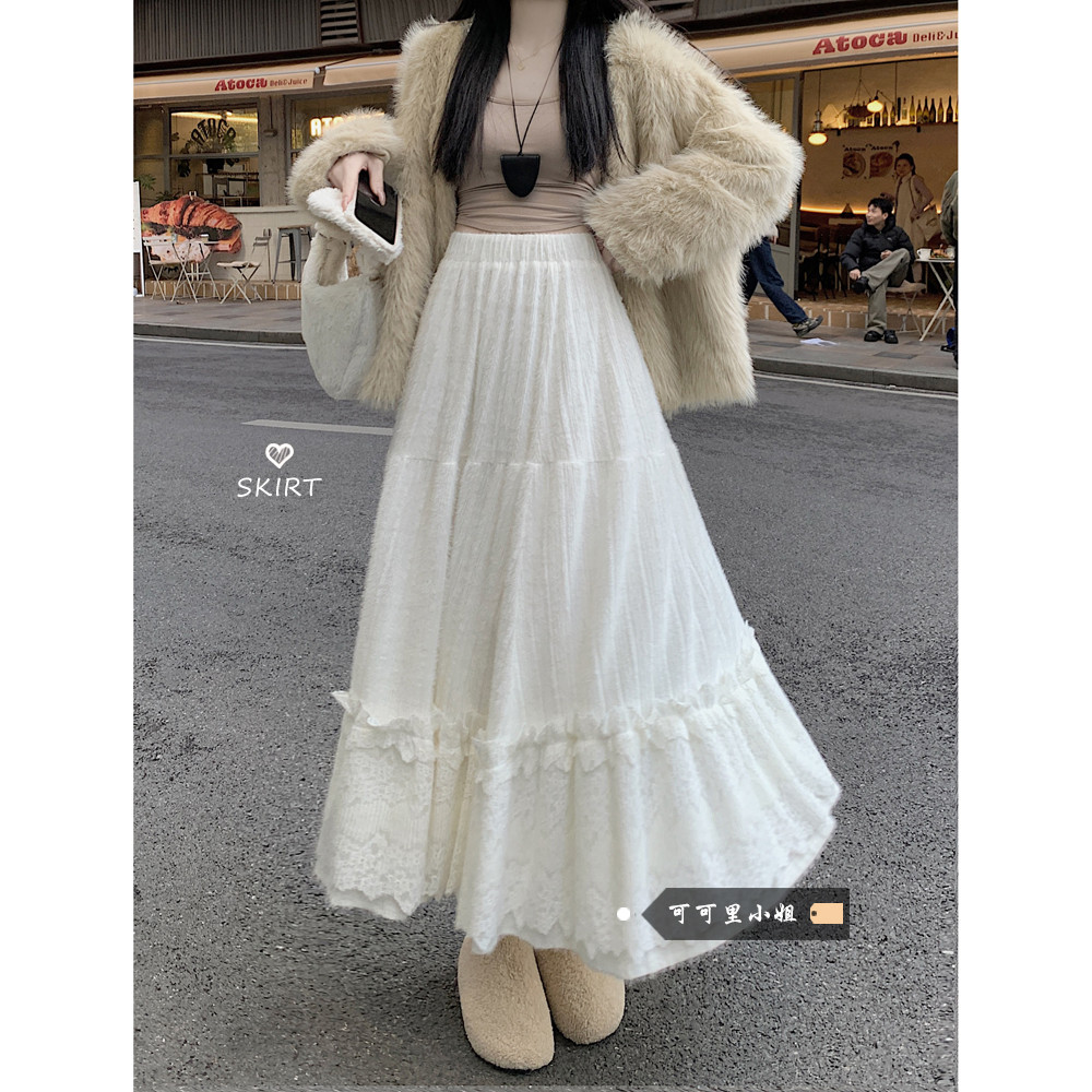 Cocory ~ Lace splicing high-waisted skirt women's 2025 autumn and winter new gentle style super fairy A-line cake long skirt