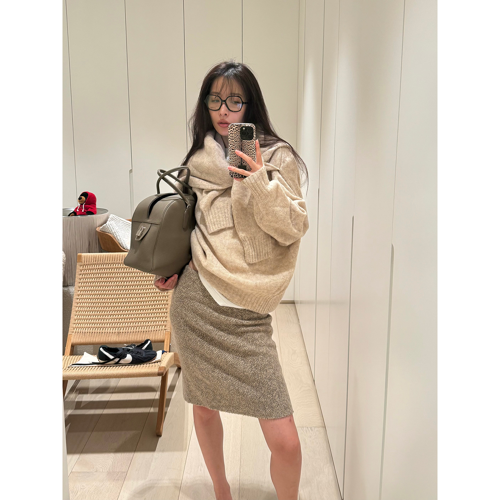 Sapphire Street Winter 80s vintage tricolor wool beige gray mid-low waist bootcut knit skirt