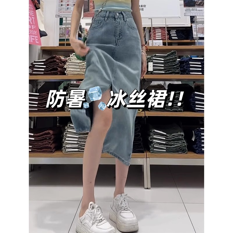 Pear-shaped figure, blue Tencel denim skirt, women's summer thin plus-size high-waisted slimming mid-length A-line skirt