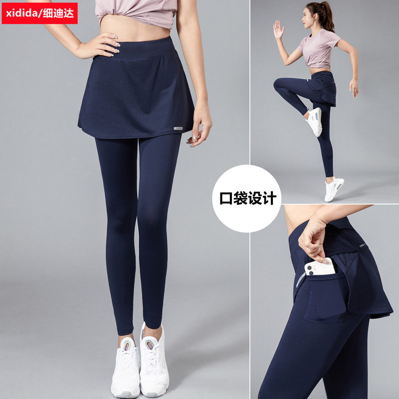 Anti-light sports shorts solid color fake two-piece running pants skirt stretch running slacks show legs long skirt women
