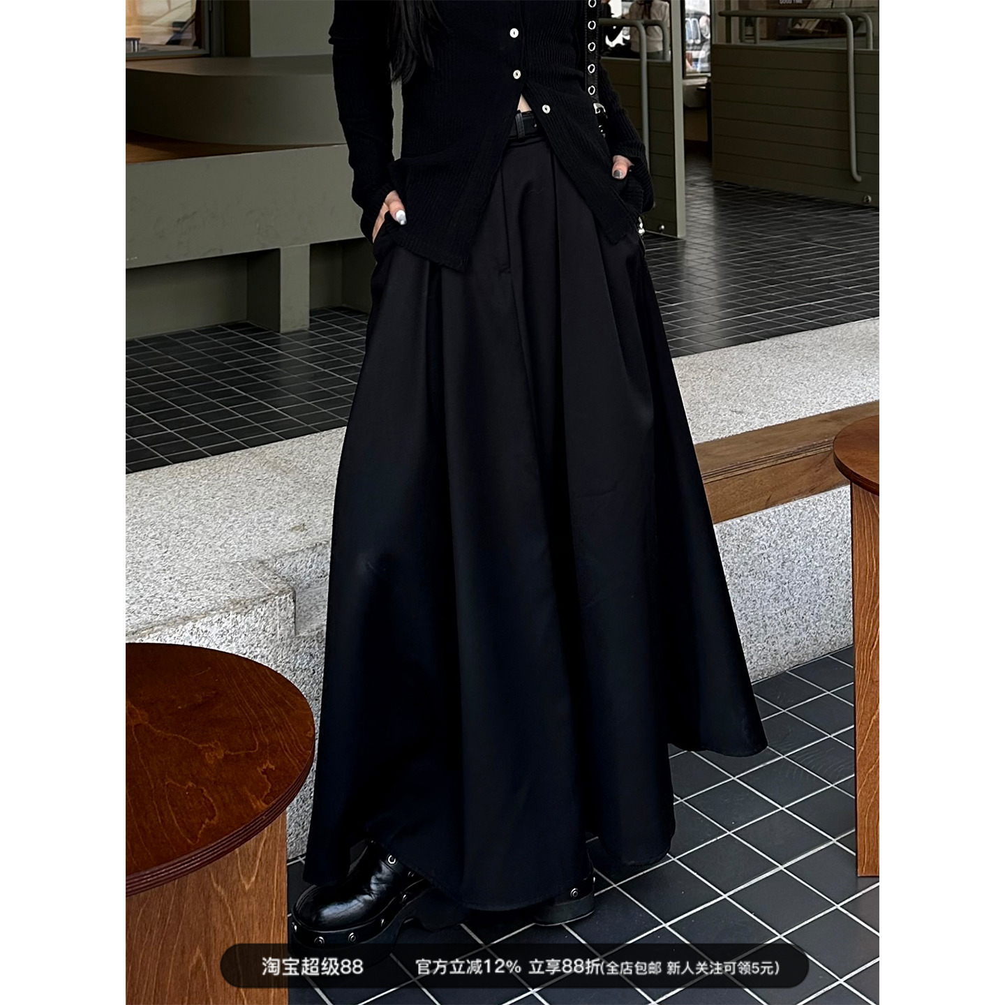 Dumb hair French vintage black skirt women's autumn and winter high-waisted slimming mid-length large pleated skirt A-line umbrella skirt