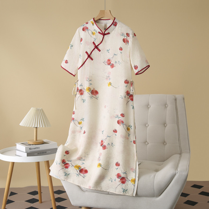 2025 summer new Chinese style retro buckle embroidered short-sleeved dress, thin stand-up collar cheongsam skirt