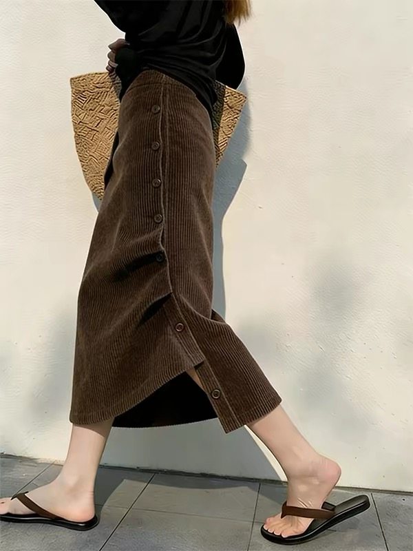 Skirt women's 2026 spring-winter Maillard vintage high-waisted temperament brown irregular button corduroy skirt