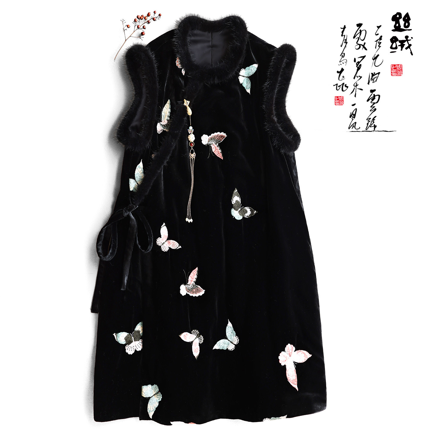 Yunshu original real velvet embroidery new Chinese style mink fur round neck plus cotton lace-up vest dress winter