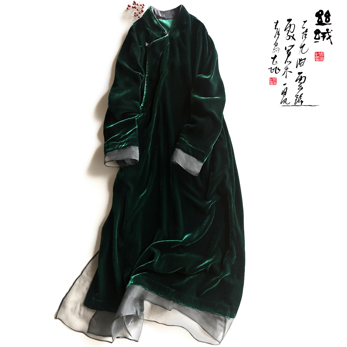 Yunshu original real velvet Chinese dress, dark green literary temperament, V-neck long skirt, autumn