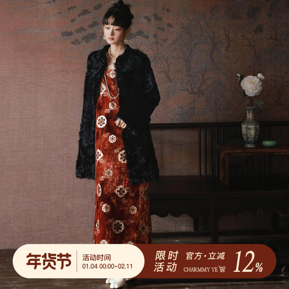 CHARMMY YE 24A/W crimson velvet print dress Baoxianghua new Chinese sundress