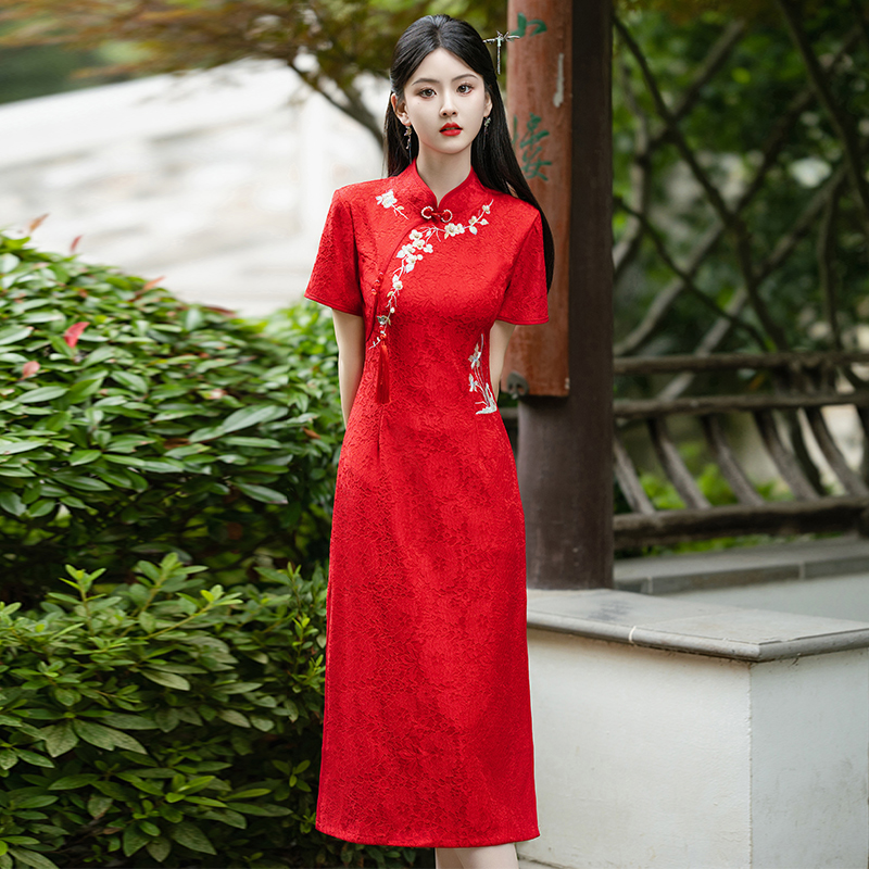2025 summer Chinese style improved version of cheongsam young girl stand-up collar slimming retro embroidered red dress