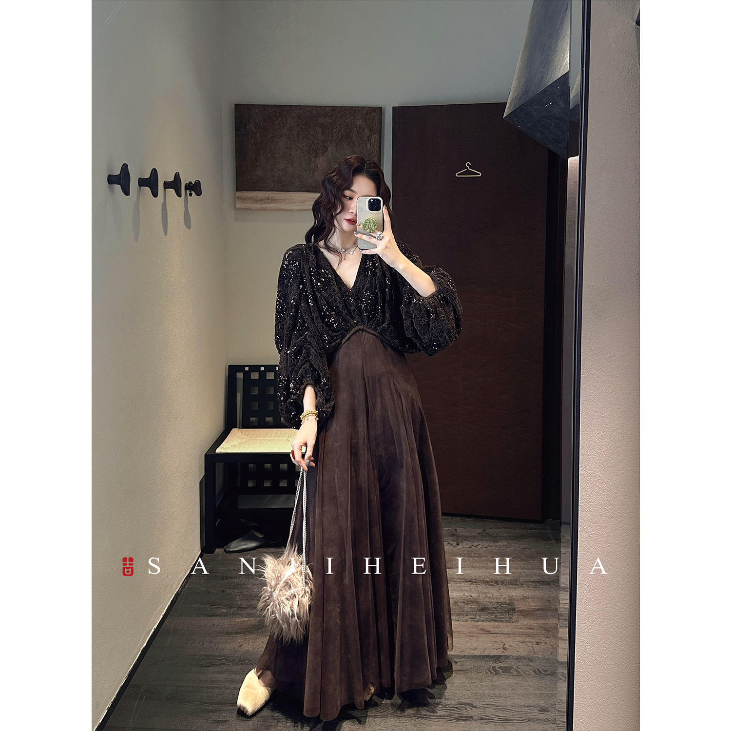 Sanji Black Flower [Shangxi] New Chinese lace mesh autumn and winter dresses dresses and long skirts are super good-looking
