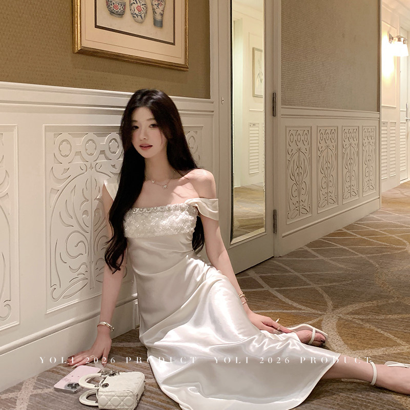 YOLI Zhang Youli "Streamer Banquet" white square neck dress women's spring light luxury high-end sense thin satin long skirt