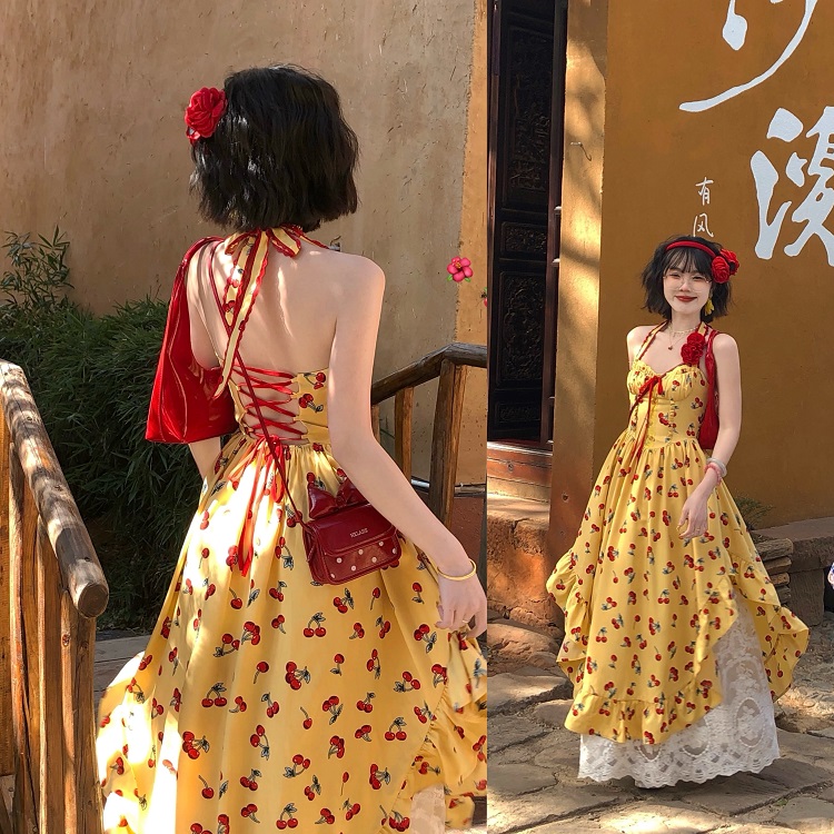 【ALITTLE Mess】"Tropical Cherry" resort-style irregular backless sundress + skirt
