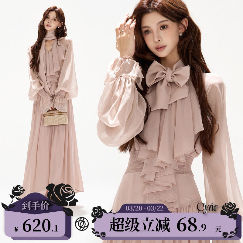 CYNR original design French court chiffon streamer V-neck lantern sleeve dress volumetric hem waist long skirt