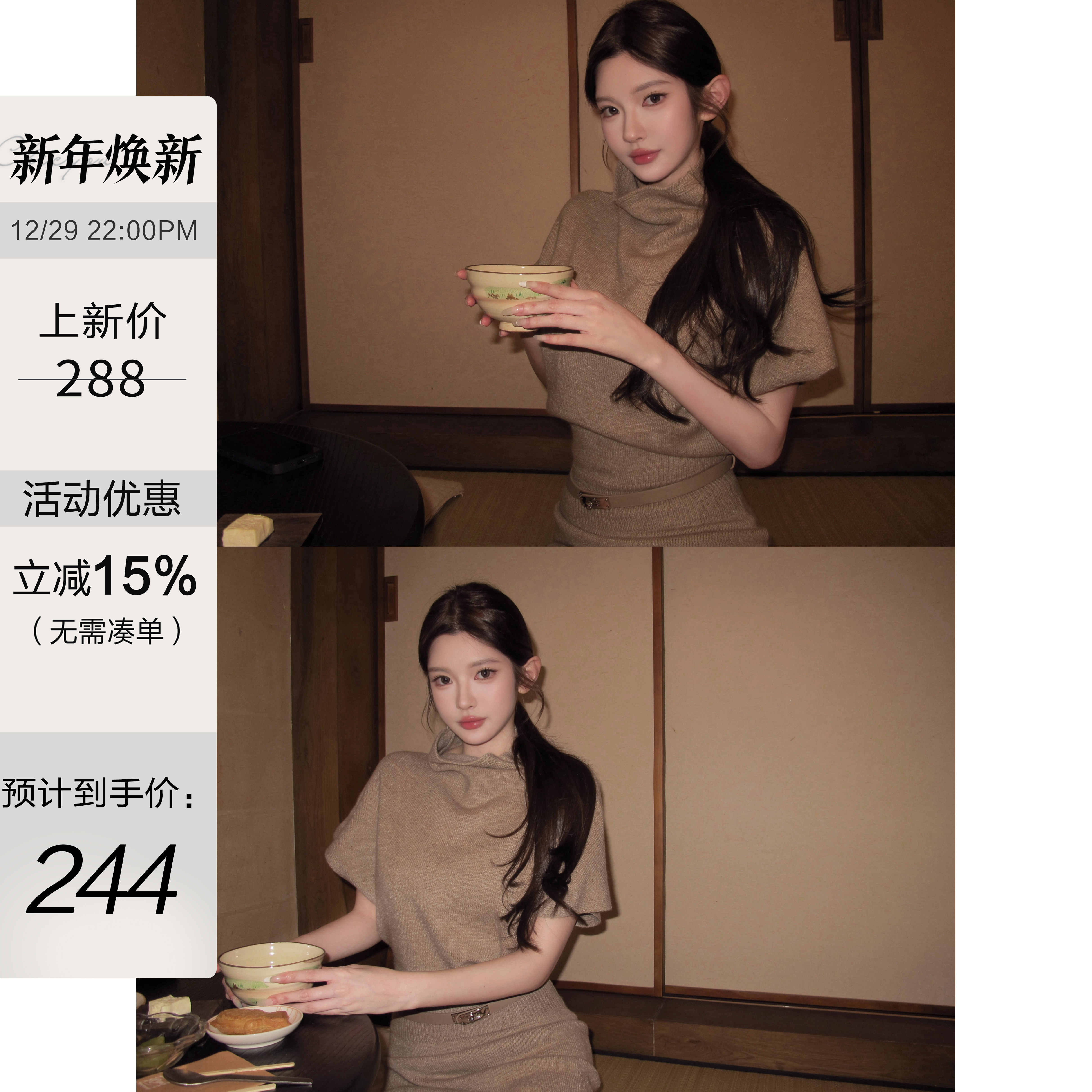 CHICYOU "Daughter Korean Girl" Luxurious temperament semi-turtleneck belt Korean short-sleeved knitted dress