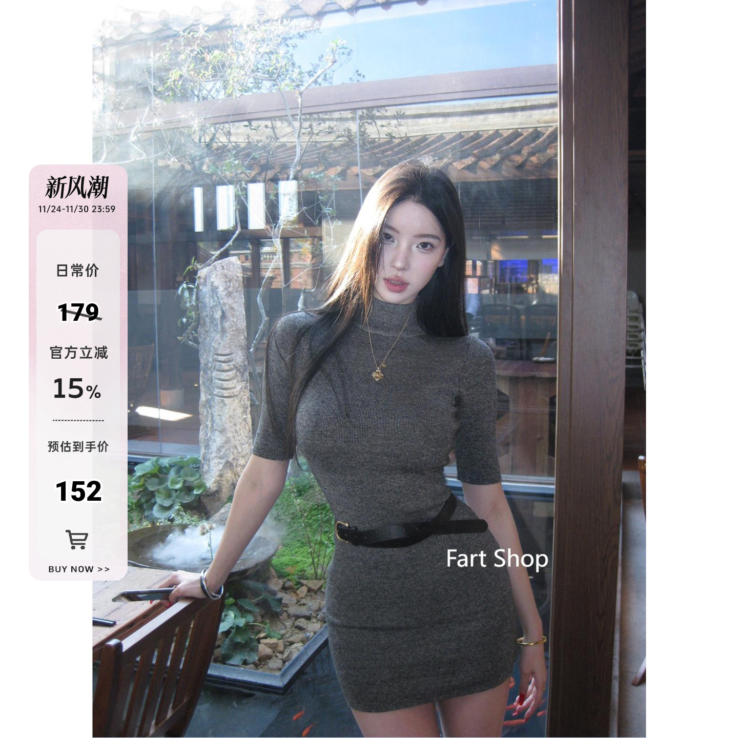 【Fart Shop】~ Royal sister hip-hugging dress women's semi-high neck wool knitted slim tight half-sleeved short skirt