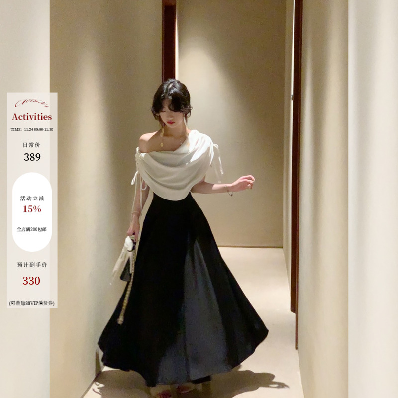 From a moment [Beverly Wife] swing neck slanted shoulder dress French temperament women's three-color waist mermaid skirt
