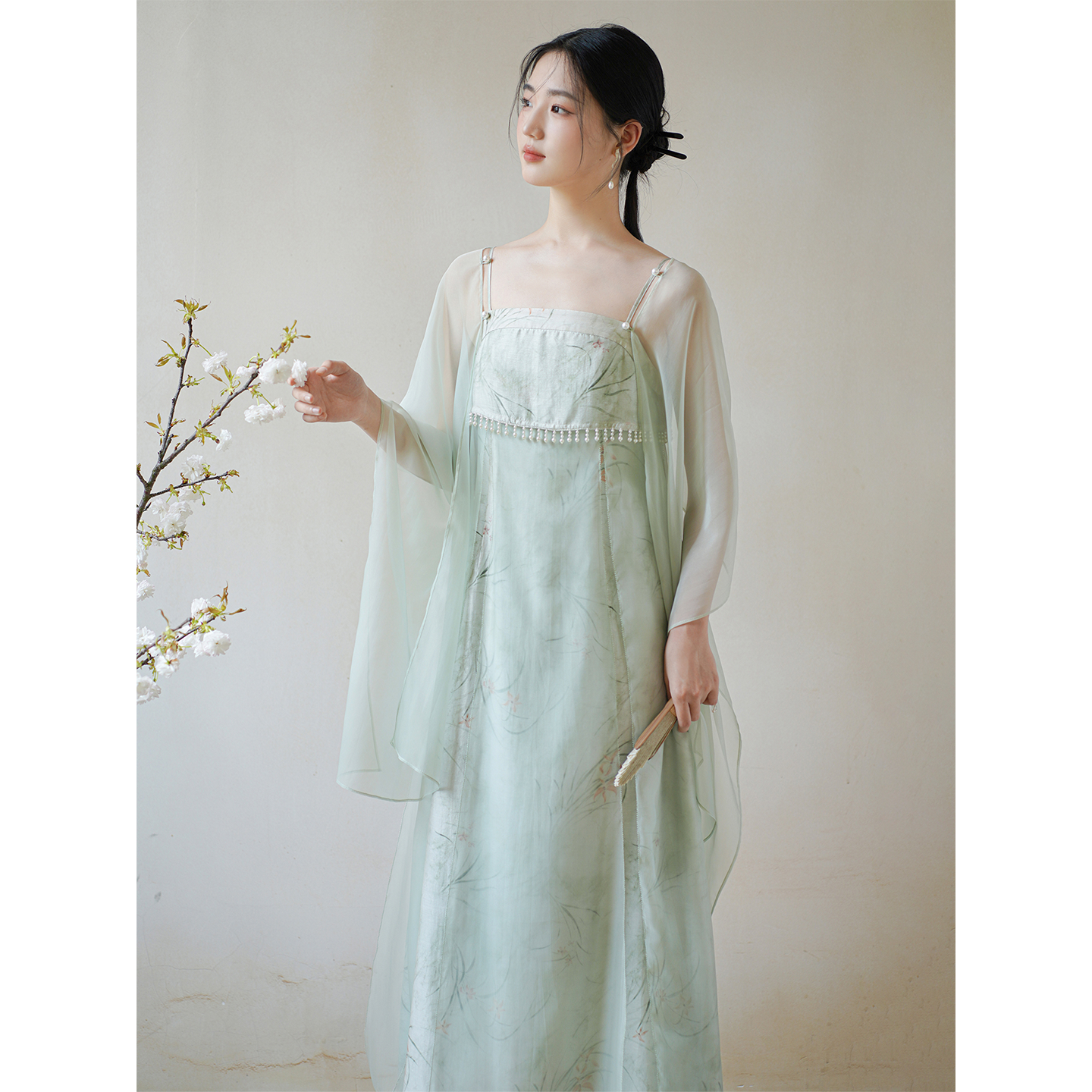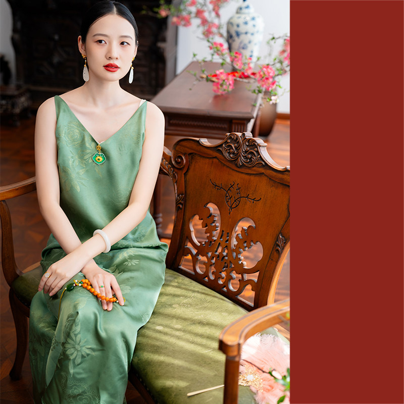 Chucian new Chinese Hanfu dress women's 2025 summer Chinese style wide sleeve jacquard green temperament strappy long skirt