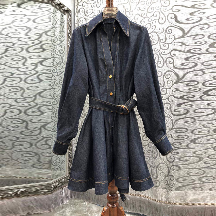 Looking back at the new European women's clothing in the fall and winter of 2025, the single-breasted lace-up belt cinched waist lantern sleeve denim dress