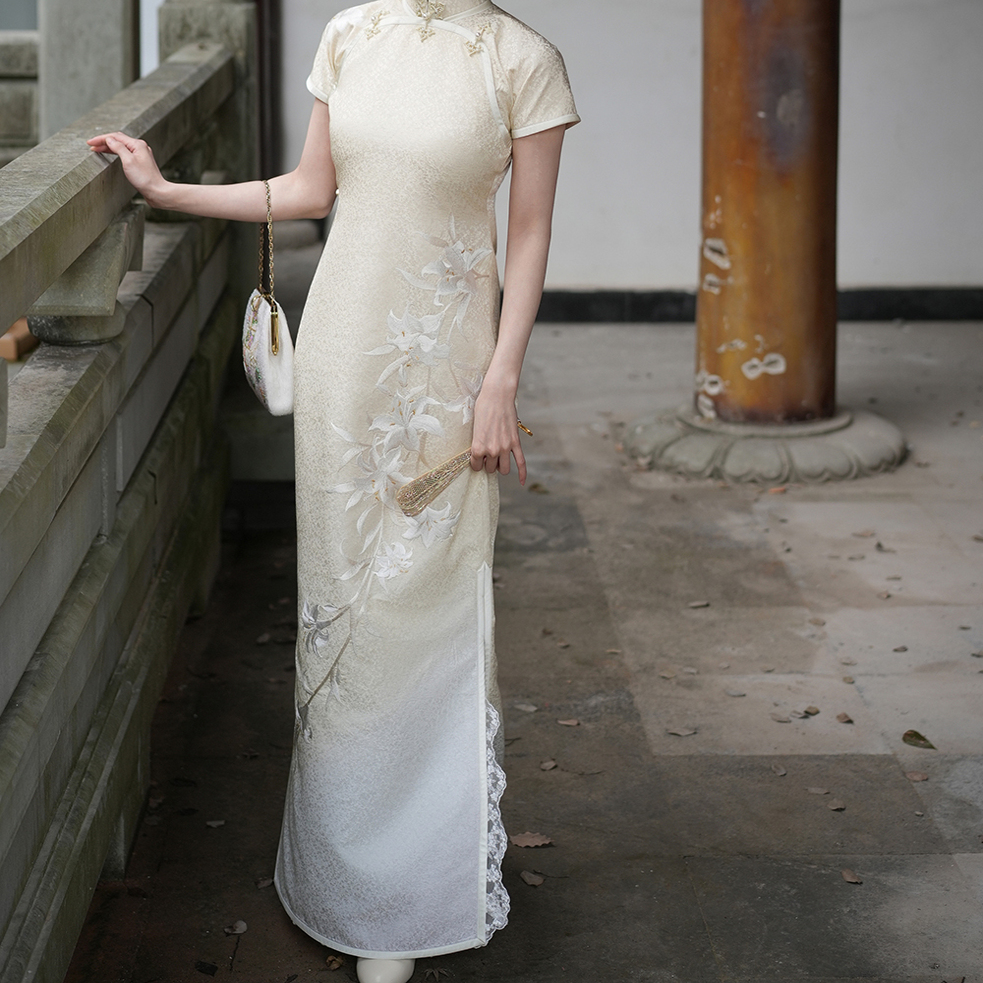 Sunset flowing gold | For a limited time, the flat cut does not save a piece of single-placket, chemical fiber tulle, single-layer cheongsam 30S to the ground