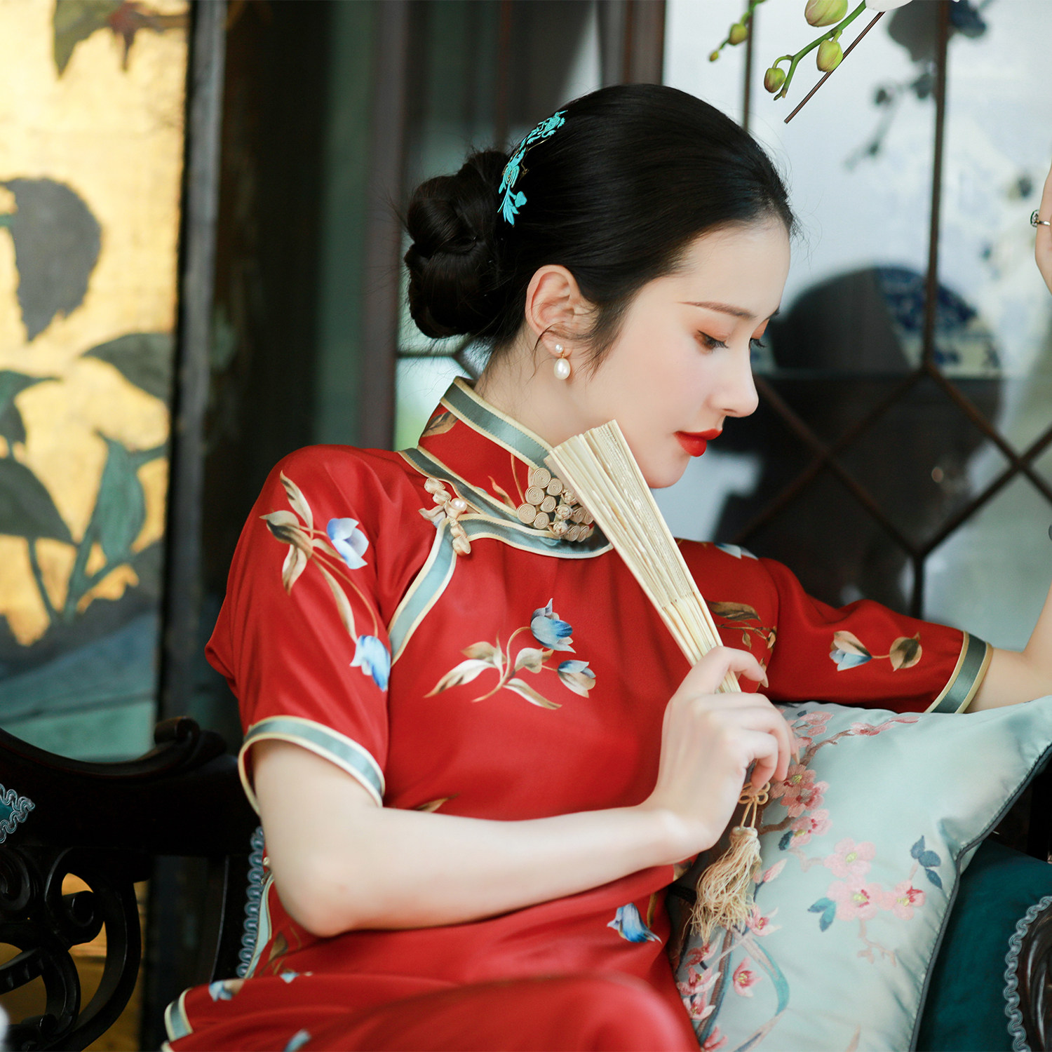 Meng Qingzhi丨A city of wind catkins丨Republic of China style embroidery hand-buckled inverted long-sleeved cheongsam skirt daily engagement toast