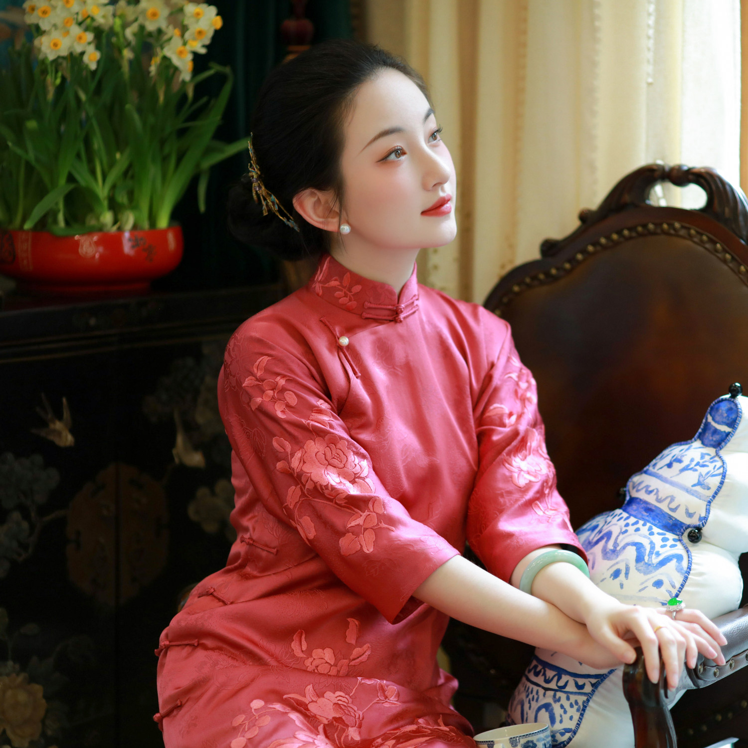 Yurun Taosi丨A city of wind catkins丨Silk fragrant cloud gauze embroidery hand-buttoned narrow-sleeved jacquard long cheongsam spring and summer