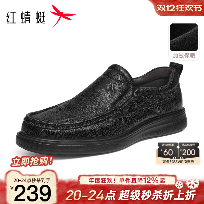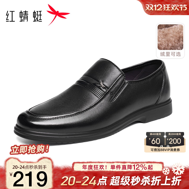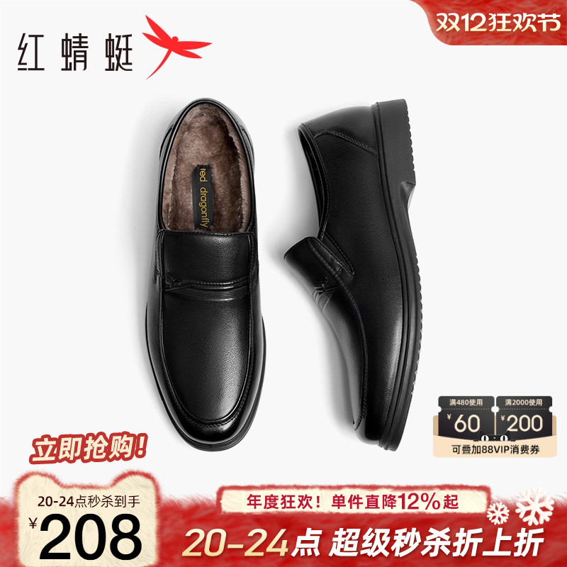 Red Dragonfly Men's Shoes Autumn and Winter New Business Casual Leather Shoes Men's Genuine Leather Cotton Shoes Soft Sole Comfortable Middle-Aged Dad Shoes