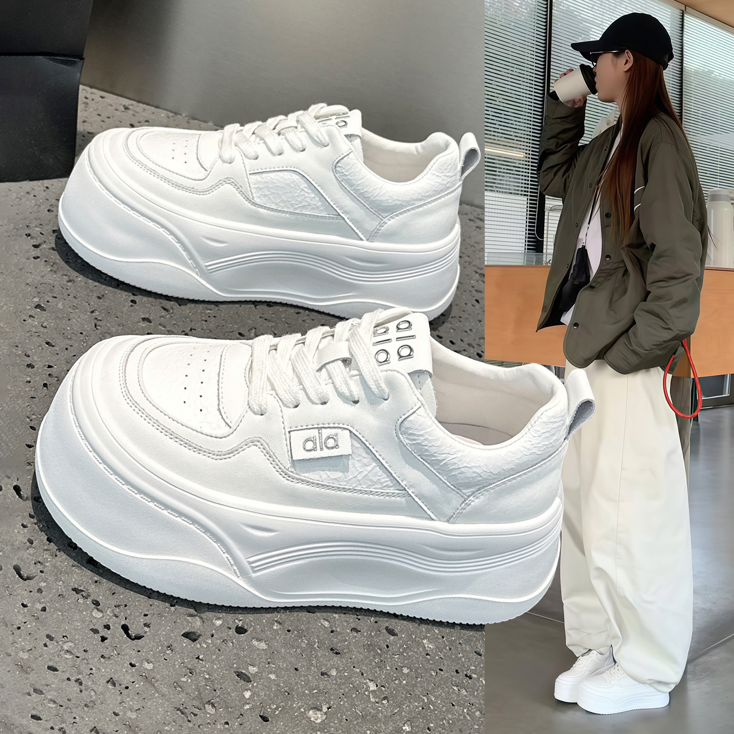 Hong Kong 2025 Spring and Autumn New Color-blocked Thick-soled Casual Board Shoes Women's Leather Versatile Height-Enhanced Round-toed White Shoes Women's Shoes