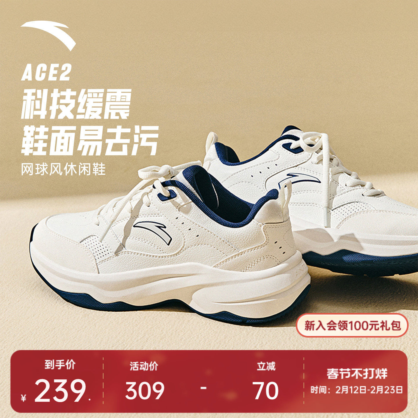 【Lin Xiaojun's same style】Anta ACE 2丨Tennis-style casual shoes, trendy sneakers, men's and women's white shoes