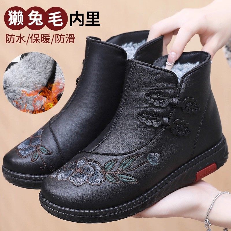 German craft women's boots, cotton shoes, winter fleece warmth, middle-aged and elderly mother shoes, waterproof and non-slip shoes for the elderly, grandma shoes