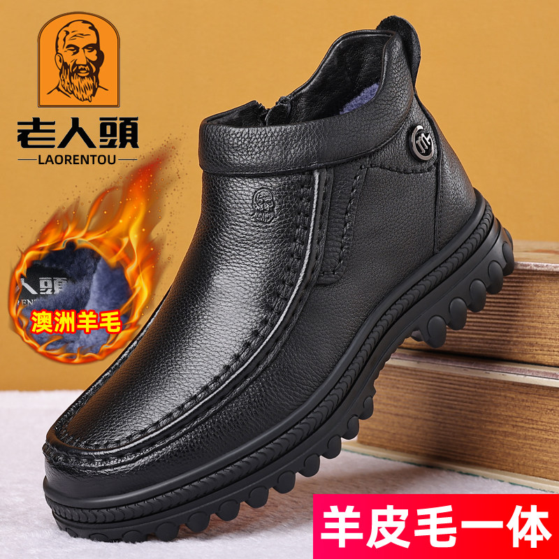 Cotton shoes for the elderly, men's leather pure wool high-top shoes, widening and thickening sheepskin and wool integrated cotton boots, platform dad shoes